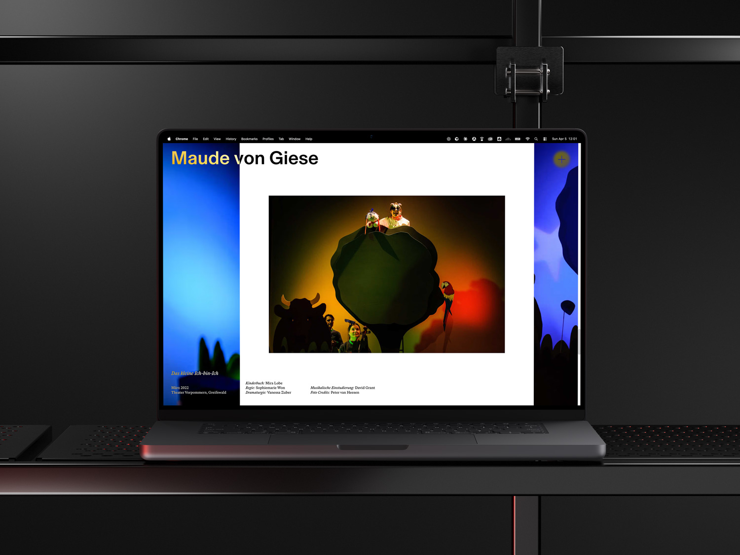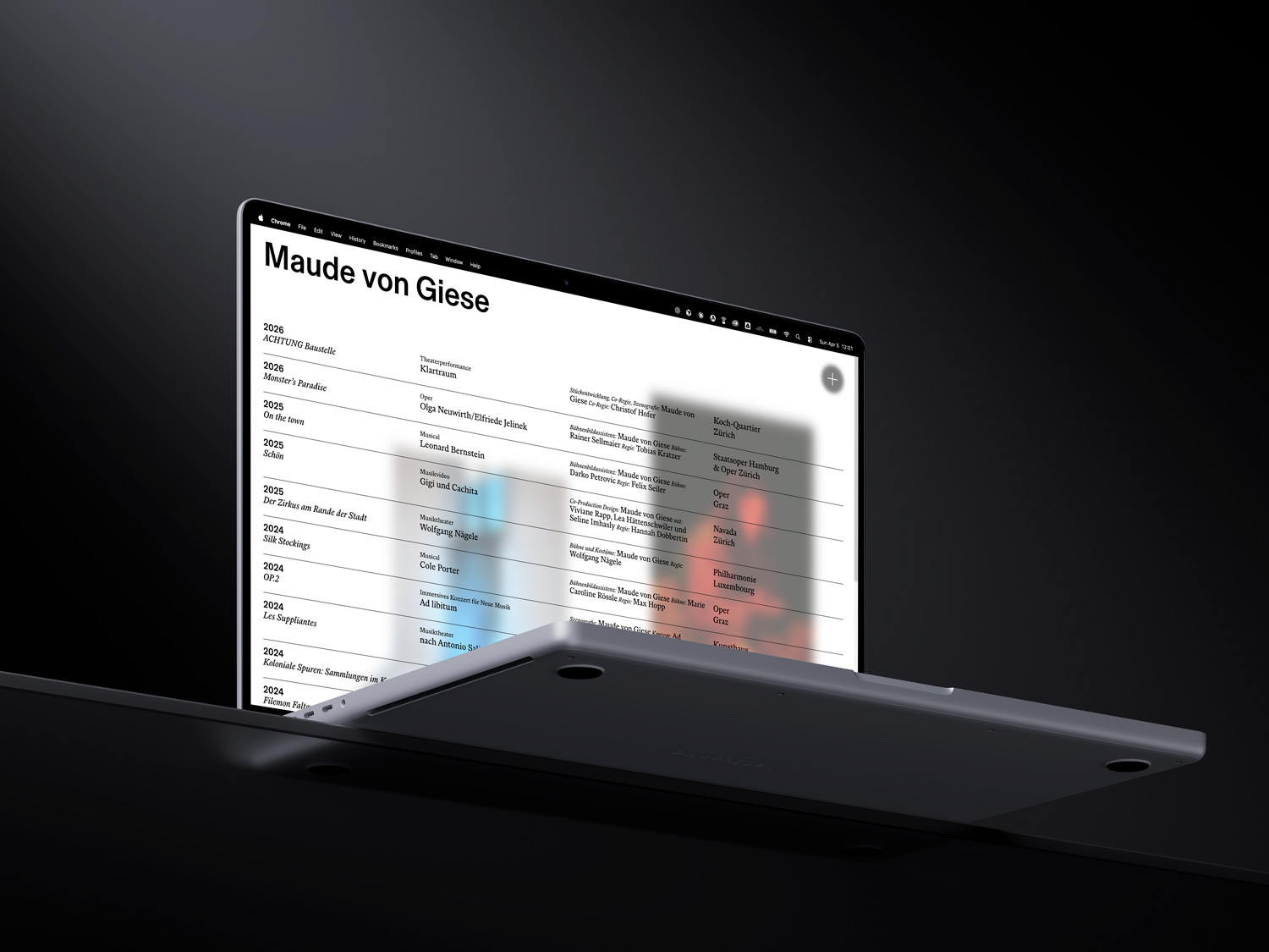 Maude von Giese is a freelance set designer and scenographer based in Zürich, working across theater, opera, film, and cultural institutions throughout the German- and French-speaking world. She needed a portfolio site that would do justice to the striking, spatial quality of her work — a digital presence as intentional and atmospheric as the stage environments she creates. Zürich-based graphic designer Lydia Perrot developed the visual concept and full design in Figma.